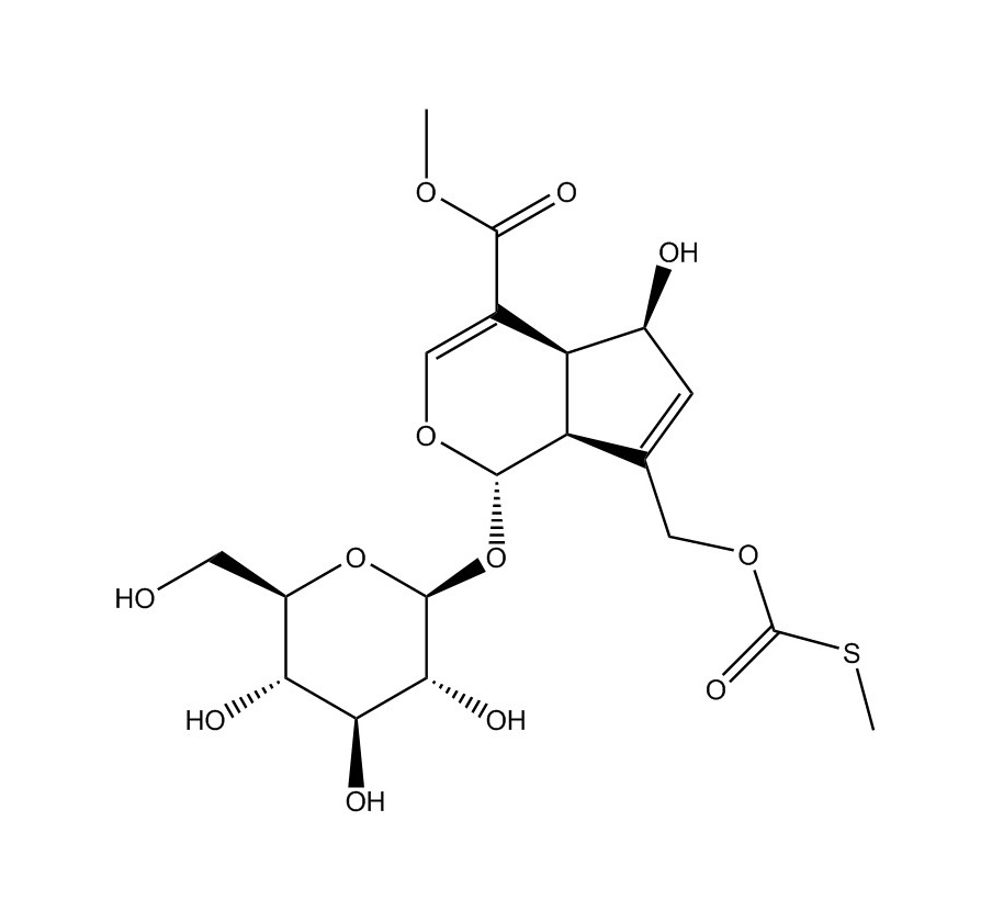 6'-O-肉桂?;蛙諀1245572-24-0[1]. Chen YF,et al.Possible mechanism involved in the antinociceptive activity of dimer of paederosidic acid and paederosidic acid methyl ester in mice.CNS Neurosci Ther. 2014 Feb;20(2):188-90.