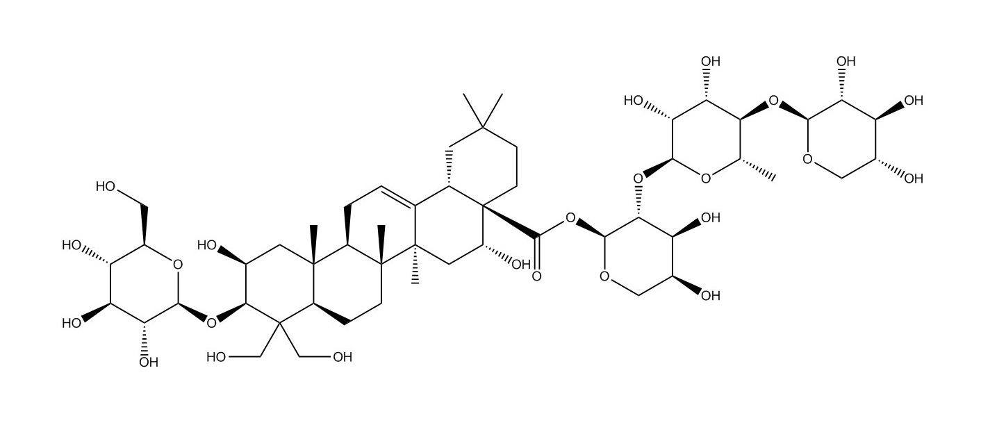 【英文別稱】 (2beta,3beta,16alpha)-3-(beta-D-glucopyranosyloxy)-2,16,23,24-tetrahydroxyolean-12-en-28-oic acid O-beta-D-xylopyranosyl-(1-4)-O-6-deoxy-alpha-L-mannopyranosyl-(1-2)-alpha-L-arabinopyranosyl ester